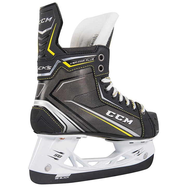 The Tacks Vector Plus skates are built from the CCM Tacks 9070 hockey skates with Super Tacks AS1 upgrades. The Vector Plus boot uses MetaFrame technology to provide an ergonomic boot along with RocketFrame Composite to maintain a light weight like the Vector Pros. The skate core is SpeedCore 2 stiffness like the Vector Pros for a rigid, lightweight, thermo-formable quality. While the 9070s have a 7mm white felt tongue, our Tacks Vector Plus skates benefit from the Super Tacks AS1 tongue for a thicker 10mm cushion of protection to protect against the hard slashes, puck contact, and lace-bite. Once again, HD Micro Fiber abrasion resistant zones assist in maintaining the longevity of this skate on the inside, so you can focus on your play and not your feet. Not only that, but multi-density memory foam and a smooth contour pad along the ankle will add the comfort you need all game long. Donβt forget the SpeedBlade Black runner for that sleek look just like the Super Tacks AS1.